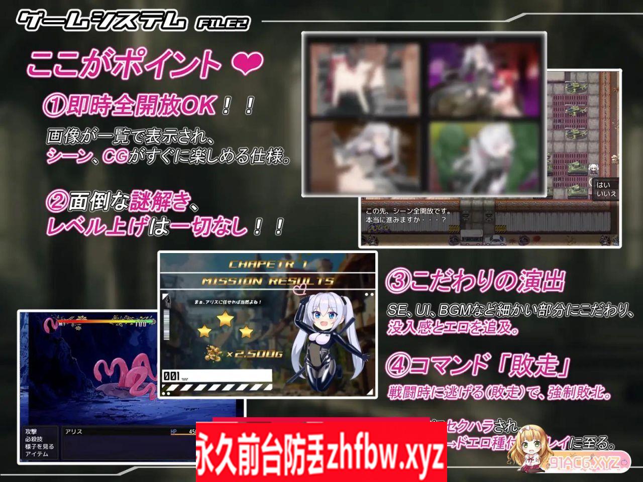 ____simple_html_dom__voku__html_wrapper____>『游戏概述』 人间界与魔界。 两个世界相连,数百年来一直进行着激烈的争斗。 人类最强的战士艾莉丝, 根据军方的指令,时光倒流到了200年前, 前往讨伐被认为是众恶之源的魔王…。 游戏概要 带有战斗的传统RPG。 ◆H场景 × 68场 ◆基本HCG × 46 ◆总CG张数 × 900张以上 ◆ED数 × 7种 (其中6种有发情状态分歧) +杂鱼END 8种 (对低级魔物等发情度达到60以上失败) ●H场景喘息声音 ●场景・CG回忆功能 可立即全部解放 ●可清除处女状态 ●带有跳过和自动功能 ●排除等级提升、解谜等元素 ◆实现性爱状态! [发情状态] 包括达到顶点次数,经验人数,接受数等的计数… [第一次伴侣] 等等也有记录! 由于发情度的不同,事件和故事有所变化,敬请留意!! ◆专注点! (1) 适合只想简单享受事件和CG的玩家的即时全开放和回忆系统。 (2) 浓厚的色情和沉浸感 追求浓郁的H事件的实用性。 此外,部分音频和SE采用了双耳式设计。 ※关于全部解放 关于即时解放功能 想要快速观看H场景的人, 或者想要立刻拿来做料理的人, 我们也提供了即时解放功能!! ① 旧发电所的闪闪发光之处 ② 城堡的私人房间书架