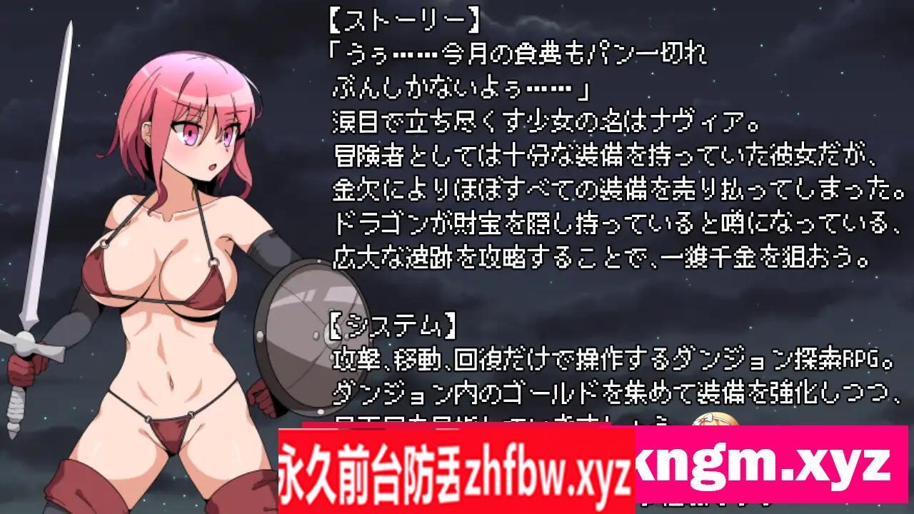 ____simple_html_dom__voku__html_wrapper____>『游戏概述』 「唉……这个月的食费只够一片面包呢……」 泪眼朦胧地站在原地的少女名叫娜维亚。 作为一名冒险者,她拥有足够的装备,但因为财政紧张,几乎把所有装备都卖了, 现在只剩下几件勉强能遮体的衣服。 她面前是一座传言中有龙藏有宝藏的广大遗迹。 她正计划攻略这座遗迹,以图翻身一夜致富。 「冒险结束后,我要重新买回卖掉的铠甲, 还要吃个肚子饱的牛排!」 [游戏性] 这是一款探索型RPG游戏,玩家可以探索地牢,用获得的金钱加强自己的能力,并朝着最底层目标前进。 尝试不同的路线,找到效率高的赚钱方法,发现击败强大敌人的方法。 如果被boss打败,游戏将切换到H场景。 H场景均以动画形式呈现,玩家可以欣赏娜维亚丰满身体的摇摆。 具有回想全开放功能。(场景中对话较短) H场景数量: 5