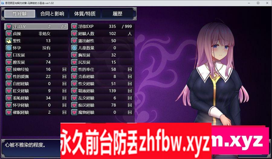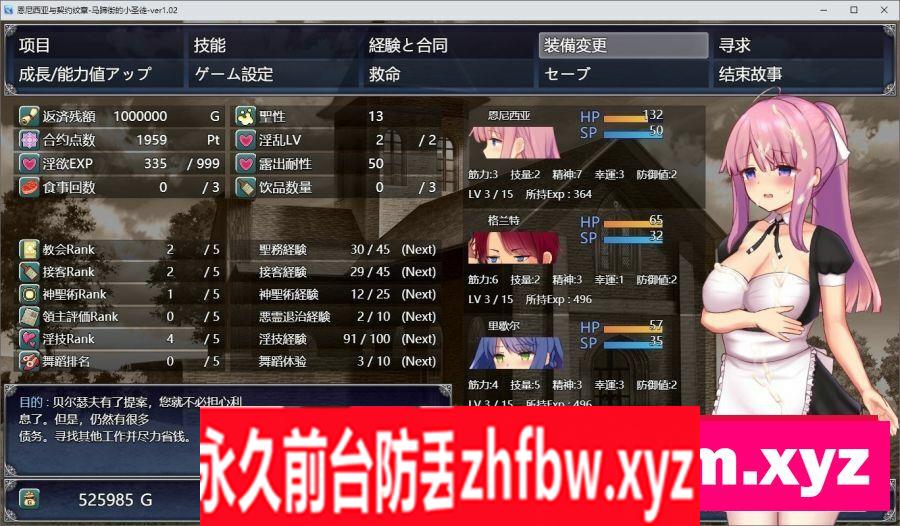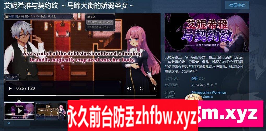 游戏内容: 艾妮希雅是个冷静的新人修女,她代理和管理着这个城市的教堂。 某天一个贸易公司的男子来到她面前,说贸易公司有权拥有这片土地。 艾妮希雅想保护这片土地,接受了提议并最终用债务买下土地的所有权。 作为延期偿还债务的条件,她被刻上了一个被称为契约纹章的神奇图案。 为了偿还债务,可怜的艾妮希雅被迫在镇上做各种奇妙的工作。 然而也有一些男人利用她的地位和善良的性格,窥视她社保的身体~ 她是否能够安全地度过这一困境,或者她是否会变成一个碧池?