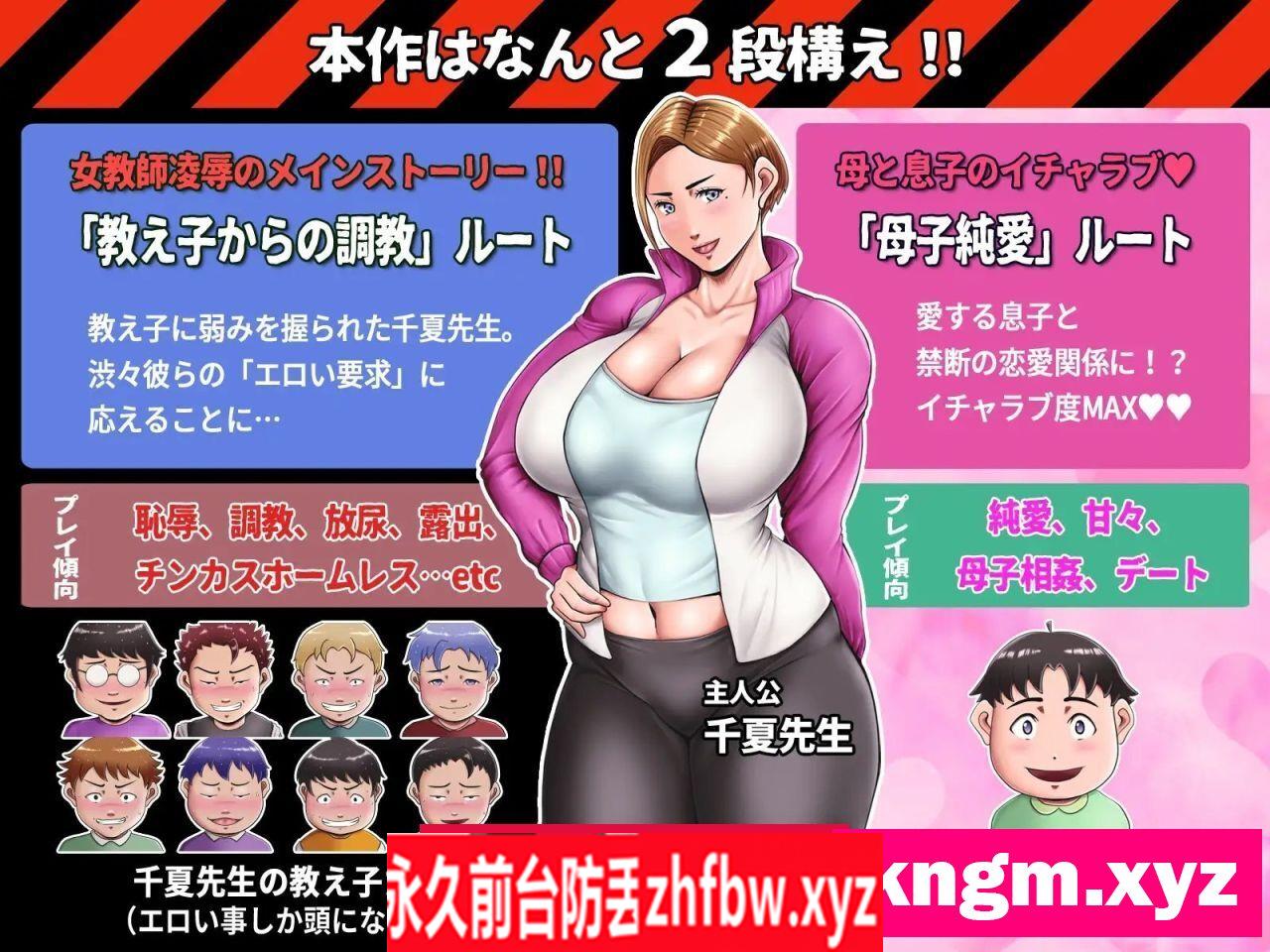 「女老师被全校肏」人妻教师凌○RPG!! 狠狠调教一位要强的女老师吧!! 以学校为背景的大容量硬核凌○RPG!! ◆本作品是全新作品。即使不知道以前的作品也可以享受◆ 本作是一款简单的探索型RPG!(没有战斗,也没有升级!) 有一天,一位女老师的弱点被她所负责的男学生抓住了。 无奈之下,她决定与他们做出“某个承诺”。那个承诺是… “我会实现大家说的任何一件事。” 性欲强烈的男学生的所有要求都是低俗淫秽的! 女教师平静的日常生活即将崩溃!! 简单射爆的游戏系统 [男学生的要求] 玩家控制千夏老师探索学校! 必须接受男学生的“色情要求”! 他们的“色情要求”全都是粗俗和侮辱性的…… 这不是轻易就能实现的…… [充满耻辱的课堂] 即使在课堂上,男同学的欲望也从未停止过! 他还会强迫你在女学生面前做出羞辱性的行为! 是保护作为一名教师的尊严? 还是屈服于他们的要求做出淫荡姿势? 无论你选择哪一个,都只会是地狱?! [各种利用学校的玩法] 收录了利用学校场景的玩法,例如体育课和泳池!! 让平时要强的老师变成玩具吧! [丰富的探索点] 为了满足学生的要求,我们有时会跳出校园 去探索“可疑地点”…… 包括“成人玩具店”、“色情DVD店”、“无家可归者公园”等! 有时候“荒凉的酒吧”里也会有可疑的兼职!? 老师和学生……禁忌游戏游行!! 即使男学生们的所有要求都得到满足,故事也没有结束!! 身为肉便器老师,身体受到进一步的虐O…… ・在学校强迫露出自拍 ・当众自慰暴露性高潮 ・破处大乱交中出 ・在街道和电车上强制露出play ・将肉体献给脏鸡巴流浪汉 ・家人在家时令人不快的NTR玩法!? …以及一系列硬核变态play! 要强的女教师,最终沦为变态女奴…… 而且……“母子纯爱”路线也实装了!! 在这部作品中,她加深了与儿子的感情, 我们还推出了可以享受母子乱○的路线!! 实现了与学生的调教剧稍有不同的甜蜜剧!! 妈妈露出可爱的雌性面孔!! 让我们充分享受这个身体吧! 母子之间有很多背德的游戏! [在家的色色日常生活] 放学回家后,花时间陪伴儿子。 一起洗澡,玩捉迷藏。 背着丈夫做色色的事情吧! [在约会中加深感情吧] 当母子感情加深了,假期就可以去约会了! 在家庭餐厅、电影院、游戏中心等各种设施中度过美好时光! 当然,到处都有色色的事件!? [从母子到男女] 母亲和孩子逐渐意识到对方是男人和女人。 儿子有一张自信男性的脸。 母亲是雌性对雄性发情时的面孔。 他们能否将彼此的关系加深到让周围的男人嫉妒的地步呢? [把妈妈据为己有!] 随着你们的关系加深,大胆而危险的游戏将成为可能! 控制你的母亲并在不同的地方肏她! 大容量和多个结局! 她会屈服于学生的调教,成为丢人的肉便器吗? 她最终会陷入禁忌之爱并以儿子的女人的身份生活吗? 或者……我们会踏入一个更加黑暗、更加变态的世界吗? 采用多重结局!!共5种 请随心所欲地用千夏老师玩吧!! ◆作品概要◆ ・色情事件基本CG 96张+多种差分 ・立绘服装:19种 ・设有回忆室(所有时间均可立即开启) ・各附有各结局的“攻略流程图”PDF ・包含音效和女性呻吟声(非完全配音) ・可以跳过文本、隐藏窗口 ・含有西瓜肚元素