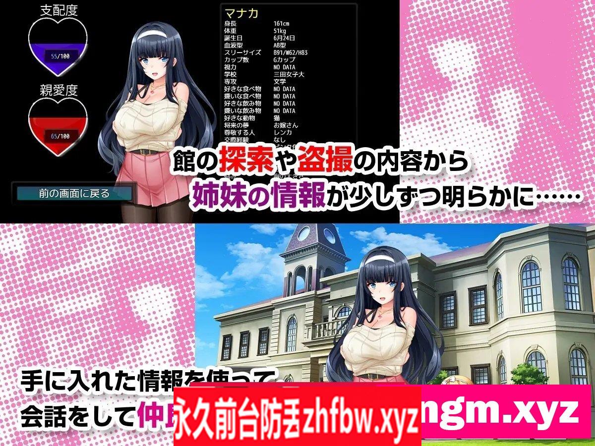 该翻译补丁由[butoa]大佬制作分享 故事 厌倦了都市生活的主人公卡梅奥(名字可更改)搬到了地方,发现小镇上有一座与周围环境格格不入的豪华宅邸。 得知这座豪宅里只住着名为玛娜卡和莲卡的美丽姐妹,主人公被她们的存在吸引,开始在远处偷拍她们的日子……。 某天,主人公偶然目睹了两人离开家的瞬间。 在远处观察着她们的主人公注意到她们忘记锁门了。 受到诱惑的主人公悄悄潜入豪宅,一时兴起借用了藏在里面的备用钥匙。 有了自由进入豪宅的能力,主人公开始用隐藏摄像头偷窥姐妹俩的生活……。 随着时间的推移,主人公的欲望不再满足于仅仅是偷拍,他开始想要更接近她们……? 最终,主人公与玛娜卡、莲卡的命运将会如何……? 系统 本作是一款探索型冒险游戏。 没有战斗场景,可以轻松推进事件。 在有限的1分钟内,探索美女姐妹居住的馆内,设置隐藏摄像头! ※可能会被调查的地方会显示动画图标 ●偷拍系统 探索豪宅内部,寻找可以设置隐藏摄像头的地方! 如果找到好地方,甚至可以看到色情画面……? 拍摄的影像可以在网上销售赚钱。 用赚来的钱物品,设置在豪宅中,以引发更色情的情景! 随着偷拍影像的增加,甚至可以威胁女主角……? ●女主角简介 通过探索和偷拍的影像内容,可以逐步解锁玛娜卡、莲卡的详细资料。 逐步揭露美女姐妹隐藏的内心世界。 ●对话系统 基于解锁的资料,可以与玛娜卡、莲卡进行对话。 通过对话,两人会逐渐对主人公开放心扉。 如果关系加深,甚至可以告白……? 情景 ·在厕所安装摄像头,偷拍排尿场景! ·在更衣室安装摄像头,偷拍换衣服的场景! ·在浴室安装摄像头,偷拍淋浴场景! ·在卧室安装摄像头,偷拍自慰场景! ·用安眠药让她们入睡,拍摄口交场景! ·用安眠药让她们入睡,拍摄口交场景! 等等…… 规格 ○类型 偷拍冒险 ○CG数量 16张(全彩) ○结局 纯爱结局2种 胁迫结局2种 后宫结局2种