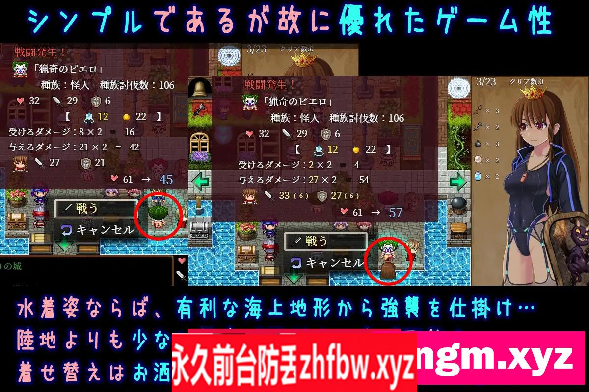 ____simple_html_dom__voku__html_wrapper____>『游戏概述』 简单的设计…却充满了冒险的乐趣! 本作是一个由体力、攻击力和防御力三种属性构成的非常简单的角色扮演游戏。 [故事] 有一天,勇者普丽西亚被国王召见,粗鲁地被命令消灭魔王。 在这种轻松的氛围中,普丽西亚的冒险故事开始了。 在冒险中,她会遇到各种人物并建立友谊。 本作的R18场景包括“在健康冒险中遇到的重要伙伴被淫荡的恶魔撕碎”的情节。 [战斗系统] 战斗是互相攻击,直到一方倒下为止的WWA形式,所以所有的单独战斗都将在“一个按钮”下决定结果。 [火热的冒险和Hack’n’slash] 敌人、道具和宝箱都会在返回城堡后重生。 您可能会迷恋于多次穿越相同的区域,但是这款游戏设计得越多冒险,收获就越丰厚。 跨越那些危险的桥梁…你将发现强大的武器和可爱的服装等着你。 冒险得越多,您可以前往的地方就越多! 阳光洒入的森林、峡谷、热闹的街道、港口城镇、沙滩、灯塔、湖泊、遗迹、雪原…! 启动游戏,即刻踏上冒险之旅。 附言 内裤类型并不是35种,而是33种。总装备数为147种。错误表述非常抱歉。